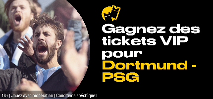 Le site de paris en ligne Bwin.be organise une promotion exceptionnelle sur la Ligue des Champions. Vous pourrez en effet gagner deux tickets pour suivre l’un des matchs les plus attendus. Celui qui opposera Dortmund au PSG le mardi 18 février 2020. Pariez avant cette date entre le vendredi 24 janvier 2020 à 00 h 01 (CET) et le dimanche 2 février 2020 à 23 h 59 (CET) pour tenter de décrocher les tickets d’entrée VIP.